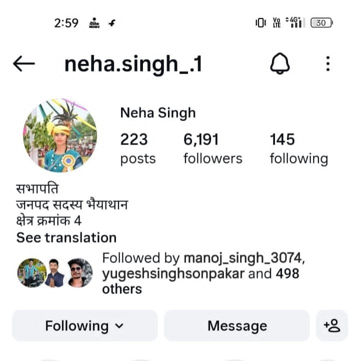 इसी बीच भैयाथान क्षेत्र में नेहा सिंह नाम की महिला के बारे में स्थानीय स्तर पर सवाल उठे हैं। नेहा सिंह सोशल मीडिया पर स्वयं को सभापति और जनपद पंचायत सदस्य, क्षेत्र क्रमांक-4 बताकर प्रचारित कर रही हैं और कई मौकों पर प्रशासनिक गतिविधियों और सामाजिक कार्यक्रमों में सक्रिय नजर आई हैं। हालांकि, जनपद पंचायत द्वारा जारी आधिकारिक सूची में उनका नाम कहीं भी दर्ज नहीं है।