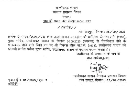 CG New Chief Secretary: रायपुरः छत्तीसगढ़ को आखिरकार अब नया मुख्य सचिव मिल ही गया है। अमिताभ जैन के बाद अब 1994 बैच के आईएएस अफसर विकास शील अब प्रदेश के नए मुख्य सचिव होंगे। इस संबंध में छत्तीसगढ़ सरकार के समान्य प्रशासन विभाग ने आदेश जारी कर दिया है।
