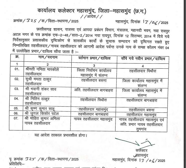 महासमुंद जिले में प्रशासनिक फेरबदल: कलेक्टर ने किए 7 तहसीलदारों के तबादले, नमिता मारकोले बनीं पिथौरा तहसीलदार