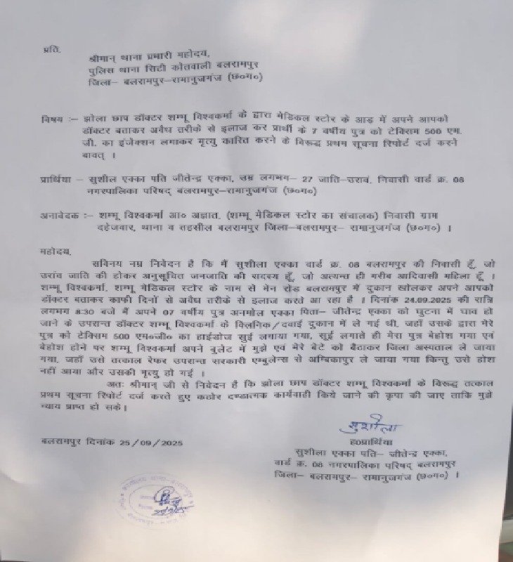 अनमोल की मां सुशीला ने इस घटना की लिखित शिकायत दर्ज कराई। उनका आरोप है कि मेडिकल संचालक ने गलत डोज दे दिया, जिससे बेटे की जान गई। परिजनों ने मामले की सख्त जांच और दोषी पर कार्रवाई की मांग की है।