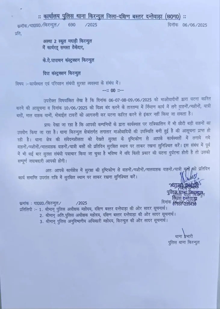 पत्र में साफ लिखा है कि अपनी मशीनरी को सुरक्षित स्थानों पर रखें. ठेकेदारों को जैसे ही ये नोटिस मिला, उन्होंने तीन के लिए काम ही रोक दिया. बावजूद इसके नक्सलियों ने बड़ी वारदात को अंजाम दे दिया.
