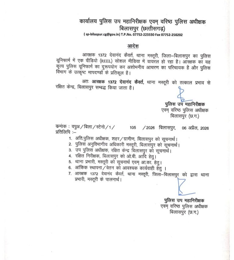बिलासपुर। पुलिस यूनिफॉर्म में रील बनाना आरक्षक के लिए महंगा साबित हुआ। बिलासपुर के आरक्षक देवानंद कैवर्त ने पुलिस यूनिफॉर्म में रील बनाकर सोशल मीडिया पर पोस्ट किया, जो वायरल होते ही विवाद का कारण बन गया। इसे यूनिफॉर्म के दुरुपयोग और अशोभनीय आचरण माना गया।