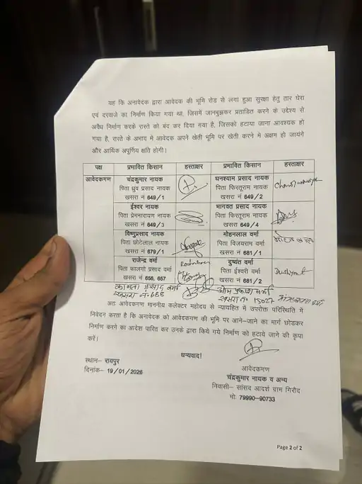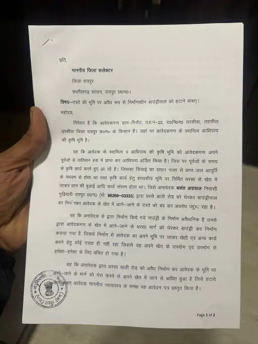 किसान अपनी शिकायत लेकर रायपुर कलेक्टर के पास भी पहुंचे थे। अपने आवेदन में उन्होंने कहा कि, खेती और सिंचाई का काम नाले से मिलने वाले पानी और शासकीय धरसा मार्ग के जरिए होता था। आरोप है कि बसंत अग्रवाल ने धरसा वाली सड़क को घेरकर बाउंड्रीवॉल का निर्माण कर दिया।