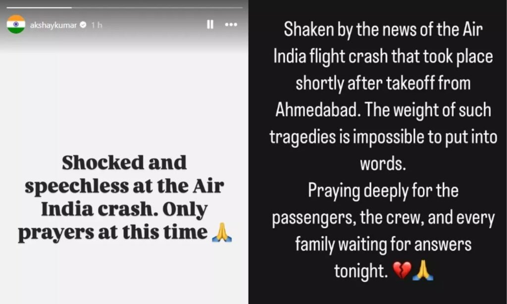 अक्षय कुमार ने इंस्टाग्राम स्टोरी में लिखा, “एयर इंडिया प्लेन क्रैश की खबर सुनकर स्तब्ध हूं। इस समय सिर्फ दुआएं ही निकल रही है।”