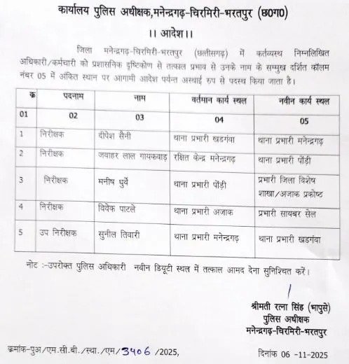 CG Police Transfer 2025: छत्तीसगढ़ के मनेंद्रगढ़ जिले में पुलिस विभाग ने 5 इंस्पेक्टर्स के स्थानांतरण आदेश जारी किए। आदेश के अनुसार टीआई सुनील तिवारी को खड़गवा थाना प्रभारी बनाया गया है। वहीं मनेंद्रगढ़ कोतवाली का नया प्रभार इंस्पेक्टर दीपेश सैनी को सौंपा गया है।