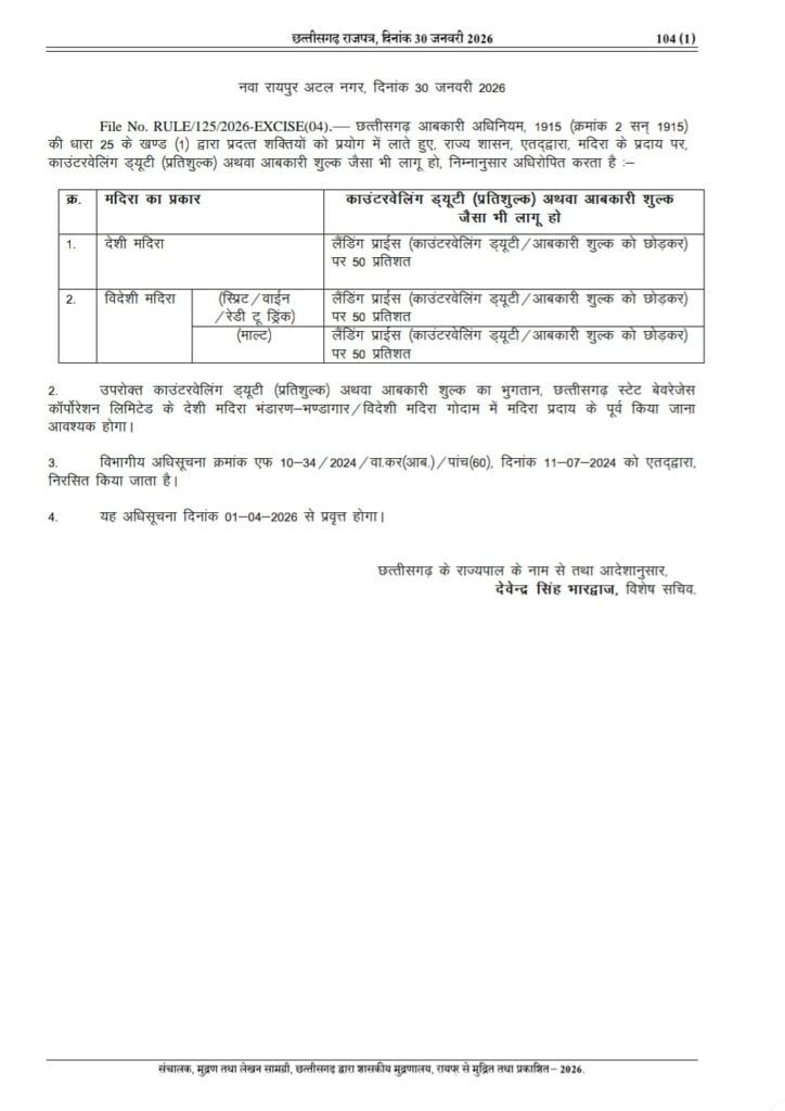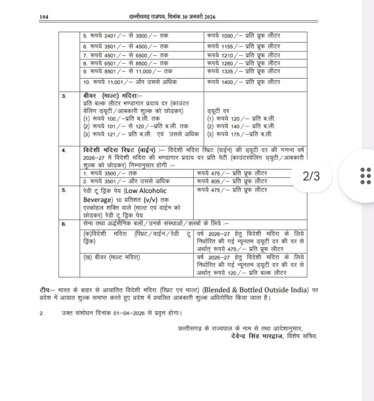 Chhattisgarh Liquor Prices केंद्रीय बजट 2026 के प्रस्तावों के अनुसार, शराब विक्रेताओं पर TCS की दर 1% से बढ़ाकर 2% कर दी गई है, जिससे कुछ ब्रांड्स के बेस प्राइस में मामूली बढ़ोतरी देखी जा सकती है।