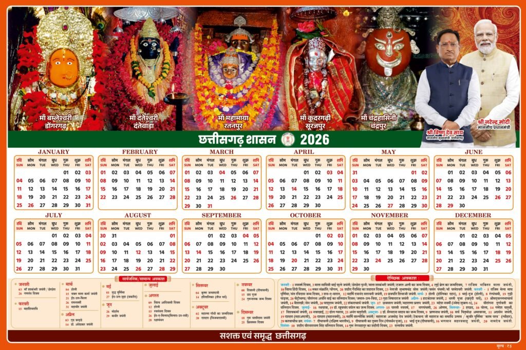शासकीय कैलेंडर के मुख्य पृष्ठ पर छत्तीसगढ़ के पांच प्रमुख शक्तिपीठ मां बमलेश्वरी (डोंगरगढ़), मां महामाया (रतनपुर), मां दंतेश्वरी (दंतेवाड़ा), मां चंद्रहासिनी (चंद्रपुर) और मां कुदरगढ़ी (सूरजपुर) को विशेष स्थान दिया गया है। इसके साथ प्रधानमंत्री नरेंद्र मोदी और मुख्यमंत्री विष्णु देव साय के छायाचित्र भी अंकित हैं। पृष्ठभूमि में सिरपुर और राजिम के मंदिर, आदिवासी संस्कृति के प्रतीक, मधेश्वर पहाड़ और चित्रकोट जलप्रपात के ग्राफिकल चित्र छत्तीसगढ़ की सांस्कृतिक और प्राकृतिक समृद्धि को जीवंत रूप में प्रस्तुत करते हैं।