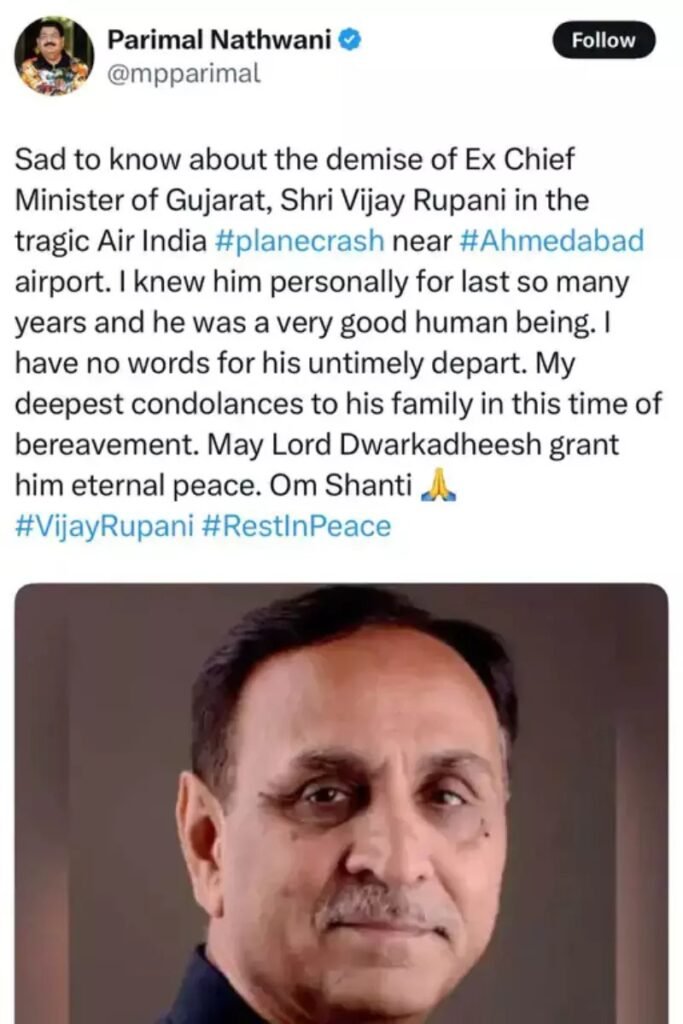बीजेपी के राज्यसभा सांसद परिमल नाथवानी ने विजय रूपाणी के निधन की पुष्टि X (पूर्व में ट्विटर) पर की। उन्होंने लिखा, “गुजरात ने आज एक वरिष्ठ नेता और महान व्यक्तित्व को खो दिया।”
