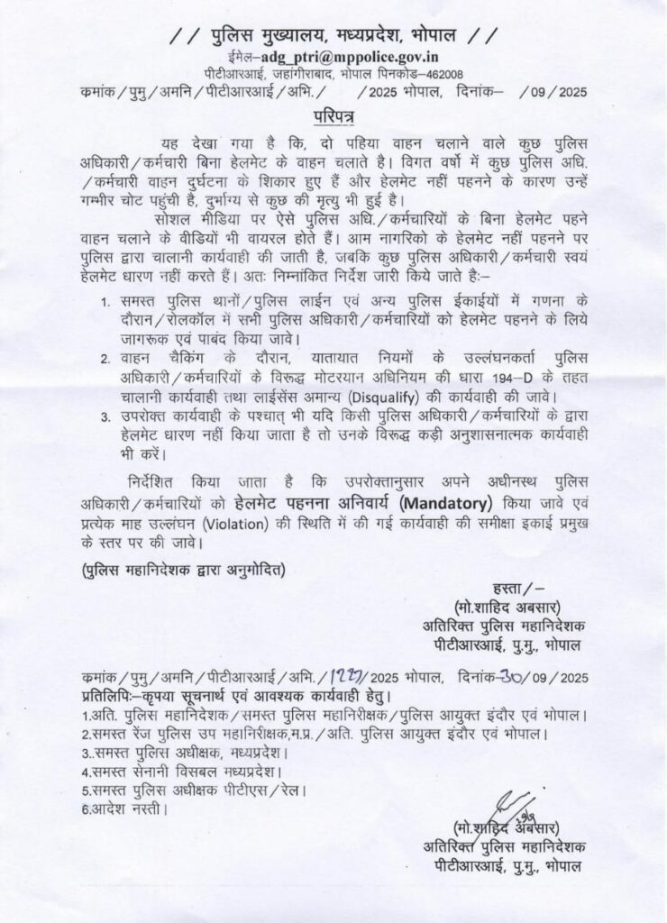 भोपाल: मध्यप्रदेश में बढ़ते सड़क दुर्घटना को लेकर सरकार अब सक्त हो गई है। आम लोगों के साथ साथ अब पुलिस प्रशासन को भी हेलमेट अनिवार्य कर दिया है। अब संबंध में पुलिस विभाग ने एक निर्दश भी जारी किया है।