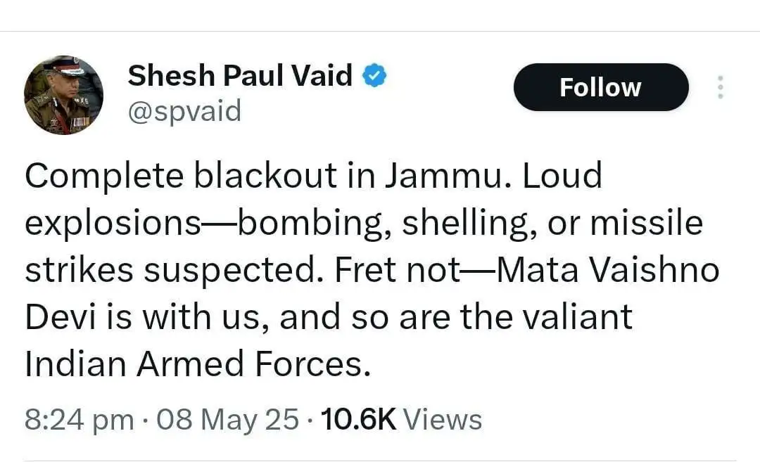 – आर्मी एयर डिफेंस यूनिट्स ने KG टॉप के पास दुश्मन के ड्रोन मार गिराए. एक पाकिस्तानी F-16 को भी मार गिराने की खबर है.