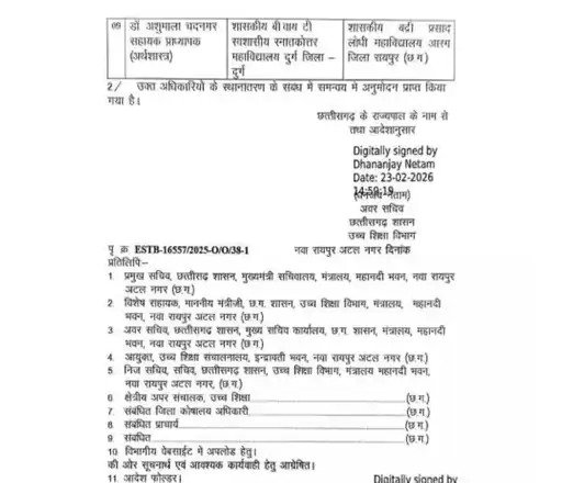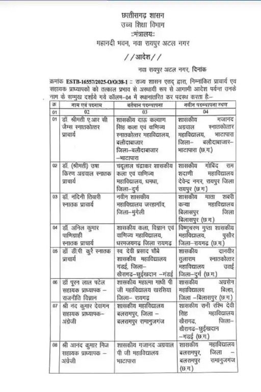 CG Higher Education Transfer News : छत्तीसगढ़ उच्च शिक्षा विभाग में एक बार फिर प्रशासनिक स्तर पर व्यापक फेरबदल किया गया है। आदेश में प्राचार्य एवं सहायक प्राध्यापकों के तबादले किए गए हैं। 9 अधिकारियों को तत्काल प्रभाव से एक कॉलेज से दूसरे कॉलेज में स्थानांतरित किया गया है।