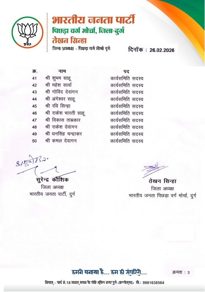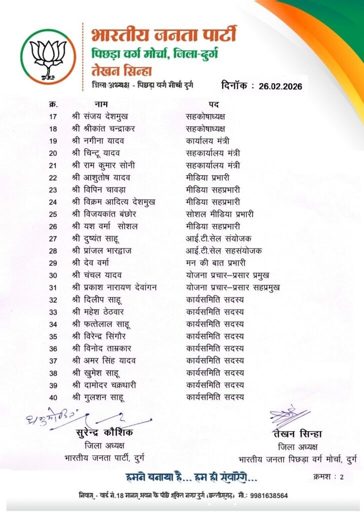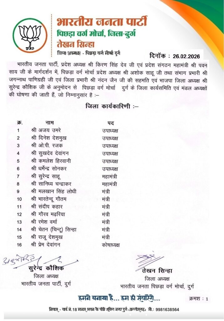 दुर्ग। भारतीय जनता पार्टी के प्रदेश अध्यक्ष किरण सिंह देव एवं प्रदेश संगठन महामंत्री पवन साय के मार्गदर्शन में, तथा भाजपा पिछड़ा वर्ग मोर्चा के प्रदेश अध्यक्ष अशोक साहू के निर्देशानुसार दुर्ग जिले की पिछड़ा वर्ग मोर्चा जिला कार्यसमिति की घोषणा कर दी गई है। यह घोषणा संभाग प्रभारी जगन्नाथ पाणिग्रही एवं जिला प्रभारी नंदन जैन की सहमति तथा भाजपा जिला अध्यक्ष सुरेन्द्र कौशिक के अनुमोदन से की गई है।
