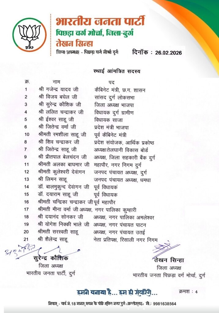 जारी सूची के अनुसार घोषित जिला कार्यसमिति संगठन को मजबूती प्रदान करने के उद्देश्य से गठित की गई है। पार्टी पदाधिकारियों ने विश्वास जताया है कि नई कार्यसमिति संगठनात्मक गतिविधियों को गति देगी तथा केंद्र एवं राज्य सरकार की जनकल्याणकारी योजनाओं को समाज के सभी वर्गों तक प्रभावी ढंग से पहुंचाने में महत्वपूर्ण भूमिका निभाएगी। पार्टी नेताओं ने नवगठित पदाधिकारियों को शुभकामनाएं देते हुए संगठन विस्तार और सामाजिक समरसता को प्राथमिकता देने का आह्वान किया है।