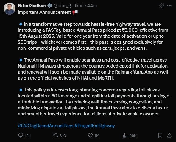 उन्होंने आगे लिखा, ‘वार्षिक पास को सक्रिय करने, नवीनीकरण के लिए जल्द ही राजमार्ग यात्रा एप और NHAI या MoRTH की वेबसाइट्स पर एक अलग लिंक उपलब्ध कराया जाएगा, जिससे प्रक्रिया सरल और सुगम होगी।’
