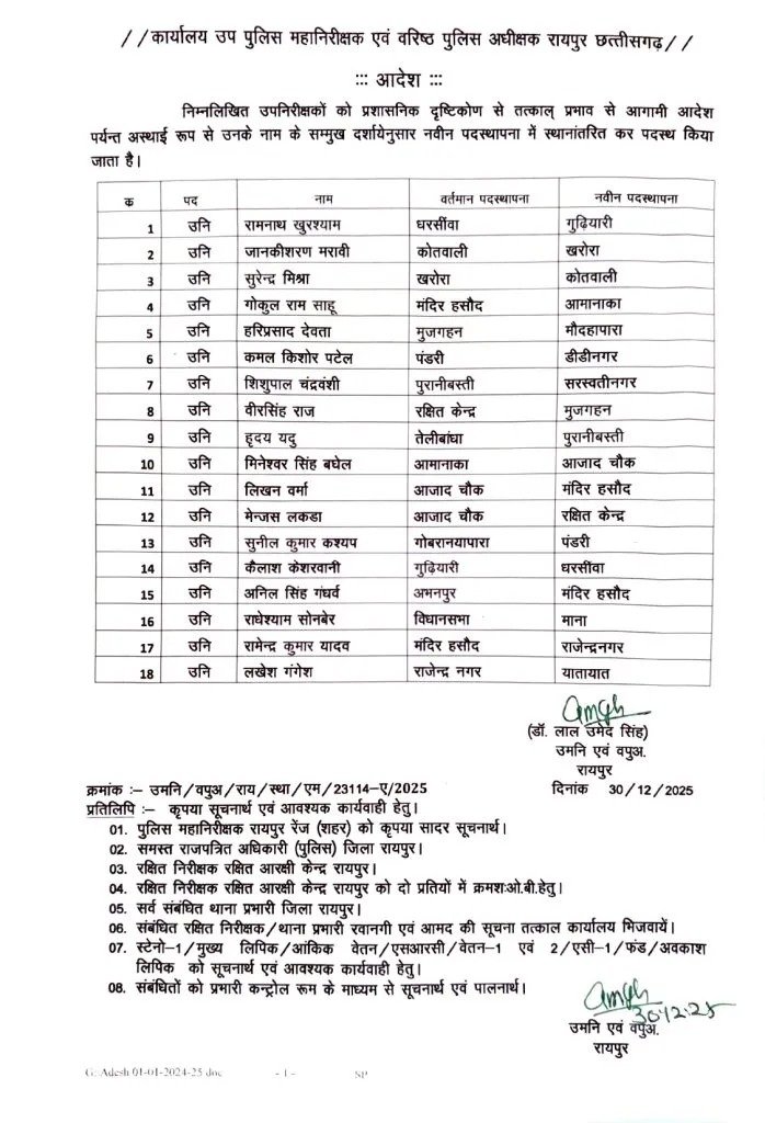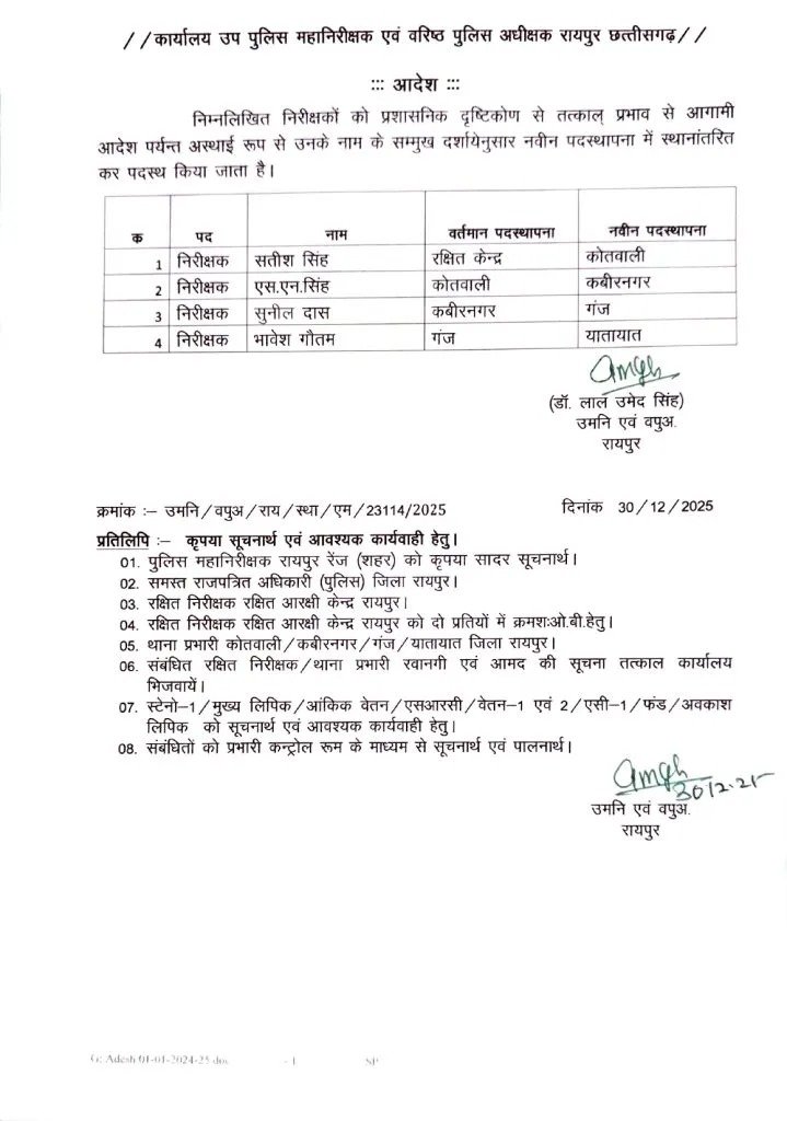 इस तबादले के तहत रायपुर जिले के तीन प्रमुख थानों के प्रभारियों को भी इधर से उधर किया गया है।