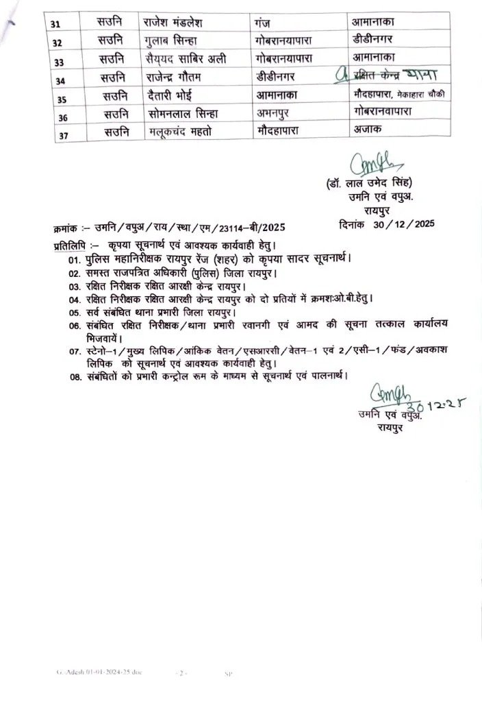 Raipur Police Transfer : साल के आखिरी दिन रायपुर पुलिस विभाग में बड़ा फेरबदल, 119 पुलिस अधिकारियों का तबादला, एसएसपी ने जारी किया आदेश