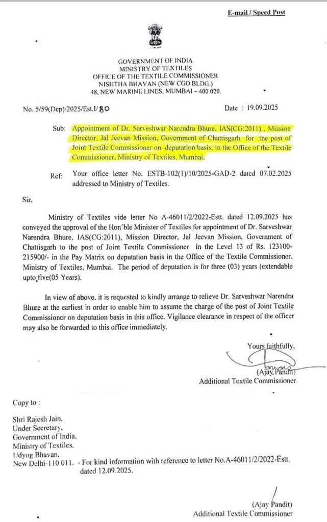 राजनांदगांव के कलेक्टर सर्वेश्वर नरेंद्र भूरे को नया दायित्व, केंद्रीय प्रतिनियुक्ति पर बने ज्वाइंट टेक्सटाइल कमिश्नर
