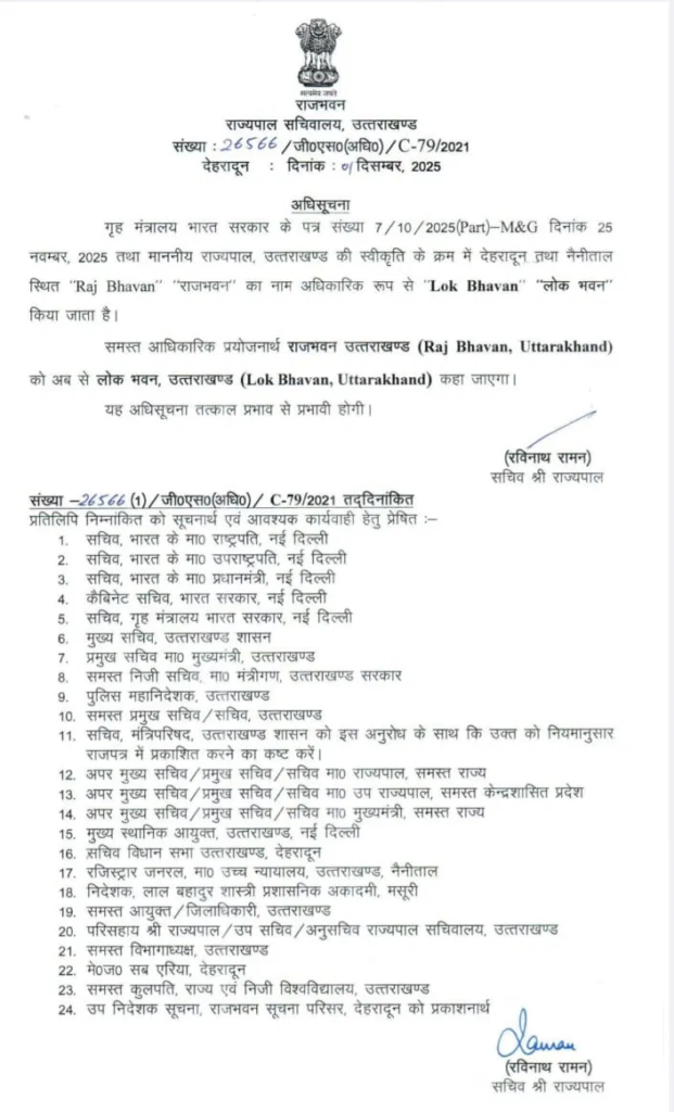 बता दें कि गृह मंत्रालय भारत सरकार के 25 नवंबर 2025 को जारी पत्र और राज्यपाल लेफ्टिनेंट जनरल (रिटायर्ड) गुरमीत सिंह की मंजूरी के बाद यह बदलाव आधिकारिक रूप से लागू हो गया है। राज्यपाल सचिव रविनाथ रमन की ओर से जारी अधिसूचना में साफ तौर से कहा गया है कि अब से उत्तराखंड के दोनों राजभवन देहरादून लोक भवन और नैनीताल लोक भवन के नाम से जाने जाएंगे।