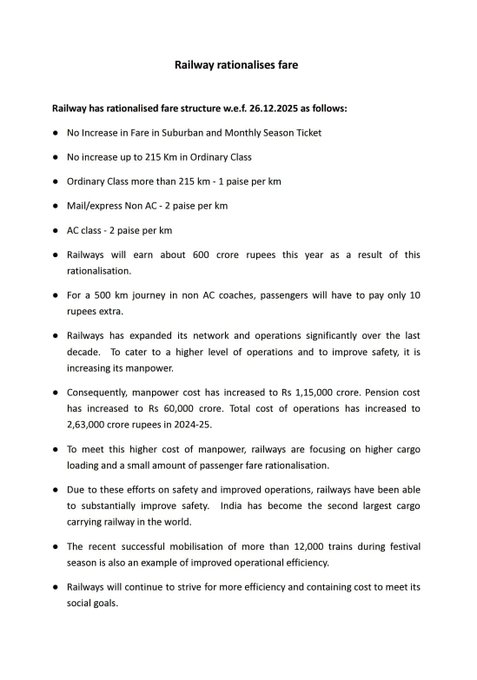 नई व्यवस्था के तहत, 215 किलोमीटर से अधिक दूरी पर साधारण श्रेणी में प्रति किलोमीटर 1 पैसा एक्स्ट्रा देना होगा। वहीं मेल/एक्सप्रेस ट्रेनों की नॉन-एसी और एसी दोनों श्रेणियों में किराया प्रति किलोमीटर 2 पैसे बढ़ाया गया है। इसका सीधा मतलब यह है कि लंबी दूरी की यात्रा करने वाले यात्रियों की जेब पर एक्स्ट्रा बोझ पड़ेगा।