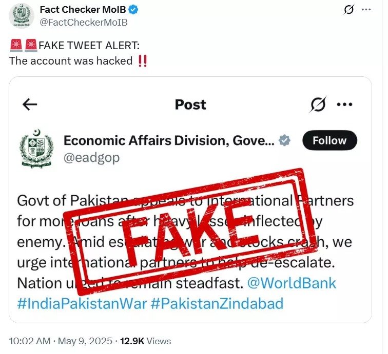 इस ट्वीट को लेकर सोशल मीडिया पर चर्चा के बीच पाकिस्तान के सूचना एवं प्रसारण मंत्रालय का दावा है कि सरकार के आर्थिक मामलों के मंत्रालय, आर्थिक मामलों के प्रभाग का ‘एक्स’ अकाउंट हैक कर लिया गया है। पाकिस्तान के सूचना एवं प्रसारण मंत्रालय ने फैक्ट चेक में इस दावे को गलत बताया है।