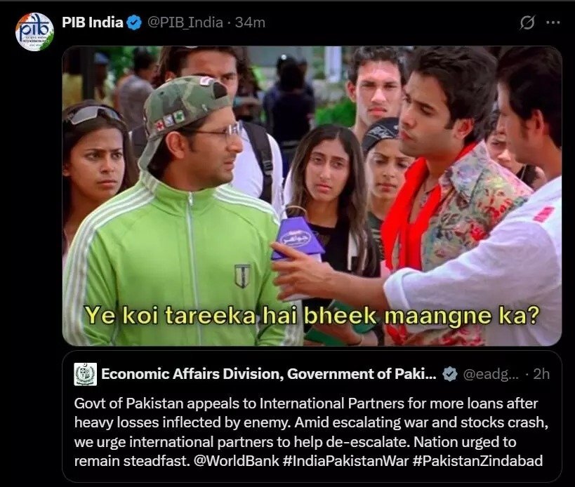 नई दिल्ली। भारत और पकिस्तान के बीच इस समय तनाव चरम पर है। ऑपरेशन सिन्दूर के तीसरे दिन पाकिस्तान के आर्थिक मामलों मंत्रालय ने एक्स पर पोस्ट करते हुए अधिक लोन की अपील की है। पाकिस्तान सरकार के आर्थिक मामलों के प्रभाग द्वारा भारी घाटे के बाद अधिक ऋण की अपील पर प्रतिक्रिया व्यक्त करते हुए पीआईबी इंडिया ने एक मीम शेयर किया। उन्होंने लिखा कि, “यह कोई तरीका है भीख मांगने का?”